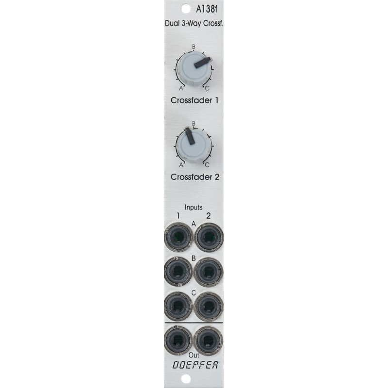 The Doepfer A-138f contains two identical crossfaders with three inputs and one output each. Three different signals are connected to the inputs A, B and C. In the counter clockwise position of the corresponding control only signal A appears at the outputs. Between counter clockwise and centre position a mix of the signals A and B appears at the output. In the centre position on signal B appears at the output. Between the centre and clockwise position a mix of signals B and C appears at the output. In the clockwise position only signal C appears at the output.