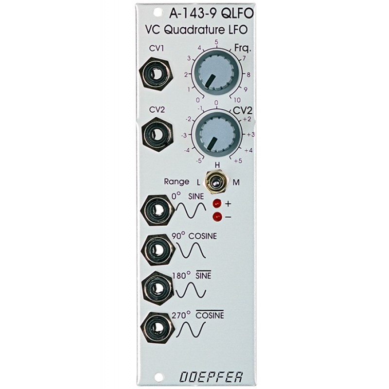 The Doepfer A-143-9 is a derivative of the A-110-6 Trapezoid thru-zero quadrature VCO. It is a voltage-controlled sine LFO with four outputs. The phase shift between the outputs is 90 degrees. The sine shifted by 90 degrees is also called cosine, the sine shifted by 180 degrees is nothing but the inverted sine, and the sine by 90 degrees is nothing but the inverted cosine.