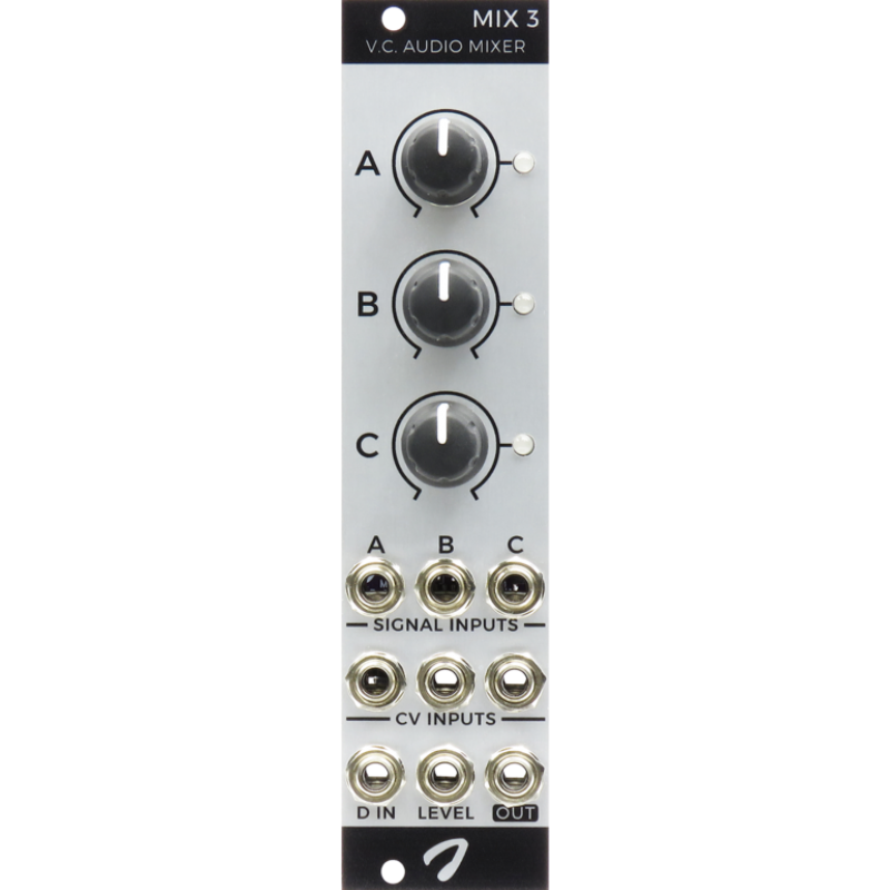 By combining a mixer and four VCAs in a single module, Mix 3 manages to provide a unique combination of compact size and functionality in just 6hp. High-end signal paths ensure extremely low noise and distortion, which is more natural for audio than linear, as it matches the human hearing. However, all signal paths are DC-coupled, so control voltage (CV) signals can be processed as well.