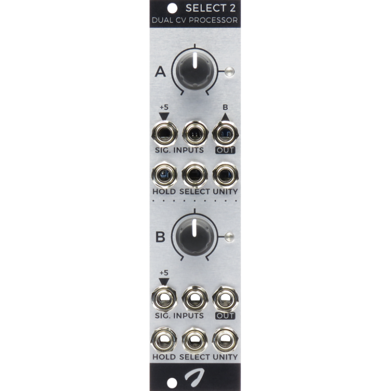 A 'Swiss Army Knife' for your modular system, Select 2 provides two highly accurate gate-controlled voltage processors in 6hp. These allow you to create, switch, mute, hold, invert, attenuate, offset, add / mix and subtract voltages, from slow control voltages(CV) up to audio frequencies.