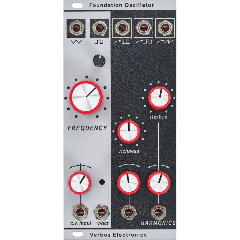 The Foundation Oscillator is the long awaited small VCO from Verbos Electronics. It is based on the same discrete transistor core as their other oscillators. In addition to outputs for the Square and Triangle waves directly from the core, there is a brand new multiplying waveshaper giving the effect of a VCO in hard sync with the core. Then, three outputs that fade between Sine and Saw, Square and Spike (a Buchla Music Easel Classic). In other words, there is a "Richness" control in that multiplies the Saw, Square and Pulse and a "Timbre" control that fades from Sine and the richer multiplied wave on 3 outputs from the same set of controls.