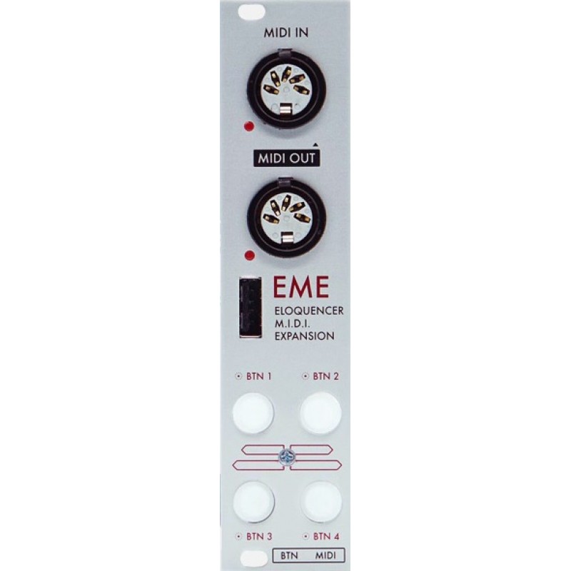 EME is the perfect companion for the Eloquencer, adding capabilities to sync with MIDI devices, control most of the Eloquencer parameters with MIDI interfaces, generating MIDI voices from the Eloquencer tracks and converting MIDI signals to the Eurorack world.